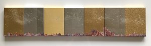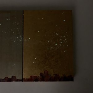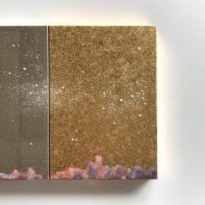 - 箔押し紙(アルミ)、箔押し紙(真鍮)、箔押し紙(錫)、岩絵具、蓄光顔料 Aluminum Leaf (Mounted on Paper), Brass Leaf (Mounted on Paper), Pewter Leaf (Mounted on Paper), Rock Color, Phosphorescent Pigment