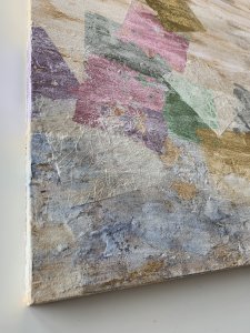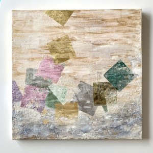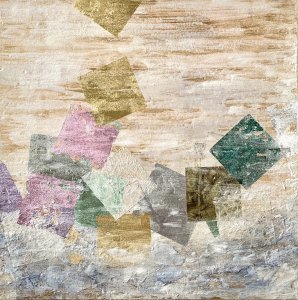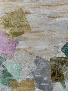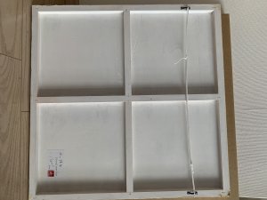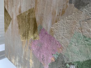 - 箔押し紙(真鍮)、金箔、銀箔、アルミ箔、岩絵具、アルキド樹脂、和紙 Brass Leaf (Mounted on Paper), Gold Leaf, Silver Leaf (dyed), Aluminum Leaf, Rock Color, Oil-Based Alkyd Resin Paint, Washi Paper
