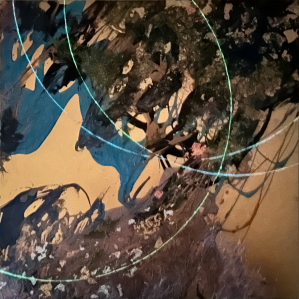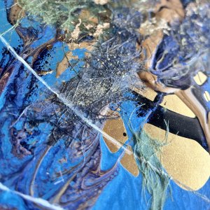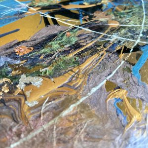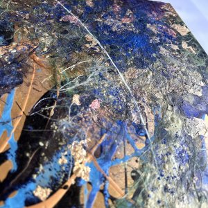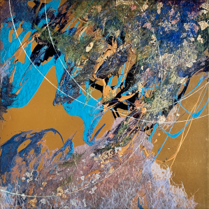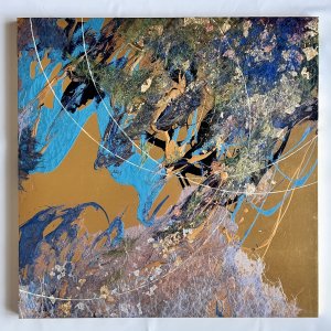 - 箔押し紙(真鍮)、アルキド樹脂、アルミ箔、銅箔、真鍮箔、岩絵具、和紙、蓄光顔料 Brass Leaf (Mounted on Paper), Oil-Based Alkyd Resin Paint, Aluminum Leaf, Copper Leaf, Brass Leaf, Rock Color, Washi Paper, Phosphorescent Pigment