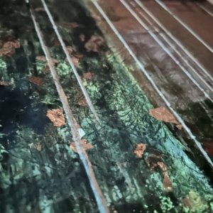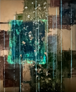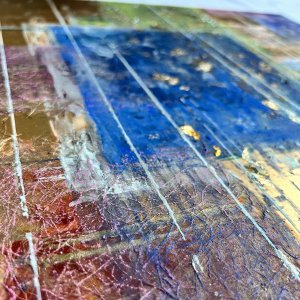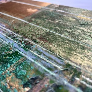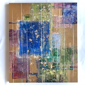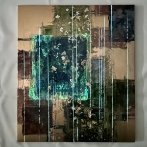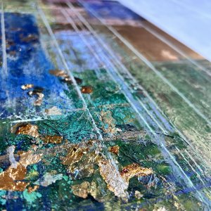 - 箔押し紙(真鍮)、アルキド樹脂、アルミ箔、銅箔、真鍮箔、岩絵具、和紙、蓄光顔料 Brass Leaf (Mounted on Paper), Oil-Based Alkyd Resin Paint, Aluminum Leaf, Copper Leaf, Brass Leaf, Rock Color, Washi Paper, Phosphorescent Pigment