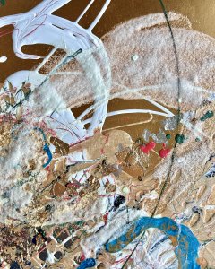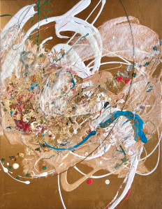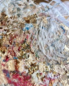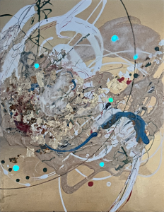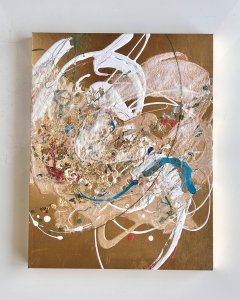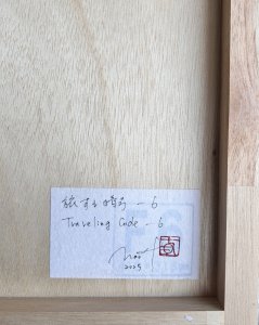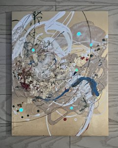 - 箔押し紙(真鍮)、アルキド樹脂、真鍮箔、アルミ箔、銅箔、岩絵具、和紙、蓄光顔料 Brass Leaf (Mounted on Paper), Oil-Based Alkyd Resin Paint, Brass Leaf, Aluminum Leaf, Copper Leaf, Rock Color, Washi Paper, Phosphorescent Pigment