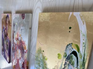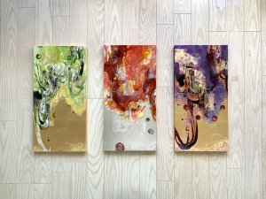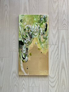 - 箔押し紙(真鍮)、箔押し紙(アルミ)、アルキド樹脂、真鍮箔、アルミ箔、岩絵具 Brass Leaf (Mounted on Paper), Aluminum Leaf (Mounted on Paper), Oil-Based Alkyd Resin Paint, Brass Leaf, Aluminum Leaf, Rock Color
