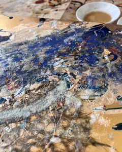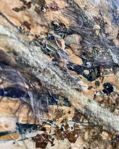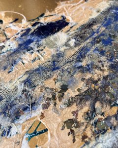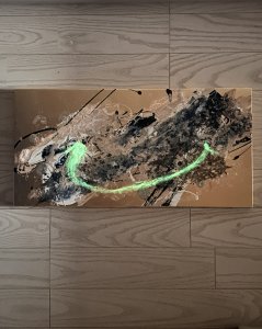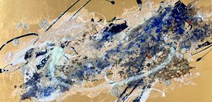 - 箔押し紙(真鍮)、アルキド樹脂、真鍮箔、アルミ箔、銅箔、和紙、岩絵具、蓄光顔料 Brass Leaf (Mounted on Paper), Oil-Based Alkyd Resin Paint, Brass Leaf, Aluminum Leaf, Copper Leaf, Washi Paper, Rock Color, Phosphorescent Pigment